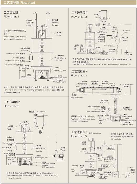 原理 : 濕物料自加料器連續(xù)地加到干燥器上部第一層干燥盤上,帶有耙葉的耙臂作回轉(zhuǎn)運動使耙臂作回轉(zhuǎn)運動使耙葉連續(xù)地翻抄物料。物料沿指數(shù)螺旋線流過干燥盤表面,在小干燥盤上的物料被移送到外緣,并在外緣落到下方的大干燥盤外緣,在大干燥盤上物料向里移動并從中間落料口落入下一層小干燥盤中。大小干燥盤上下交替排列,物料得以連續(xù)地通過整個干燥器。中空的干燥盤內(nèi)通入加熱介質(zhì),加熱介質(zhì)形式只有熱水和導(dǎo)熱油,加熱介質(zhì)由干燥盤的一端進入,從另一端導(dǎo)出。已干燥物料從最后一層干燥盤落到殼體的底層,最后被耙葉移送到出料口排出,真空型盤式干燥器的濕氣由設(shè)在頂蓋上的真空泵口抽出。從底層排出的干物料可直接包裝。通過配加翅片加熱器、溶劑回收冷凝器、袋式除塵器、干料返混機構(gòu)、引風(fēng)機等輔機,可提高其干燥的生產(chǎn)能力,干燥膏糊狀和熱敏性物料,可方便地回收溶劑,并能進行熱解和反應(yīng)操作。